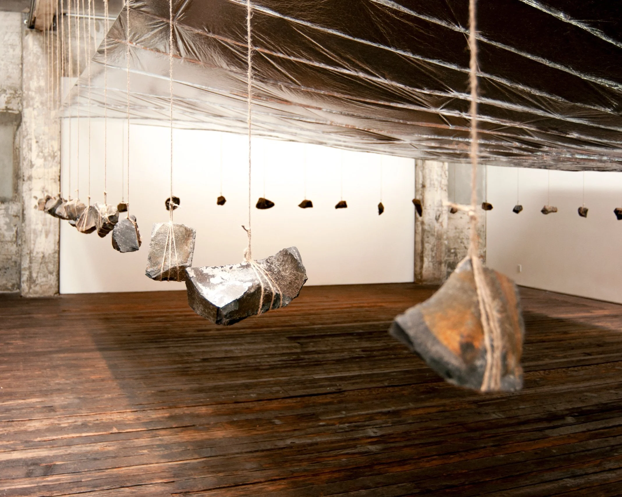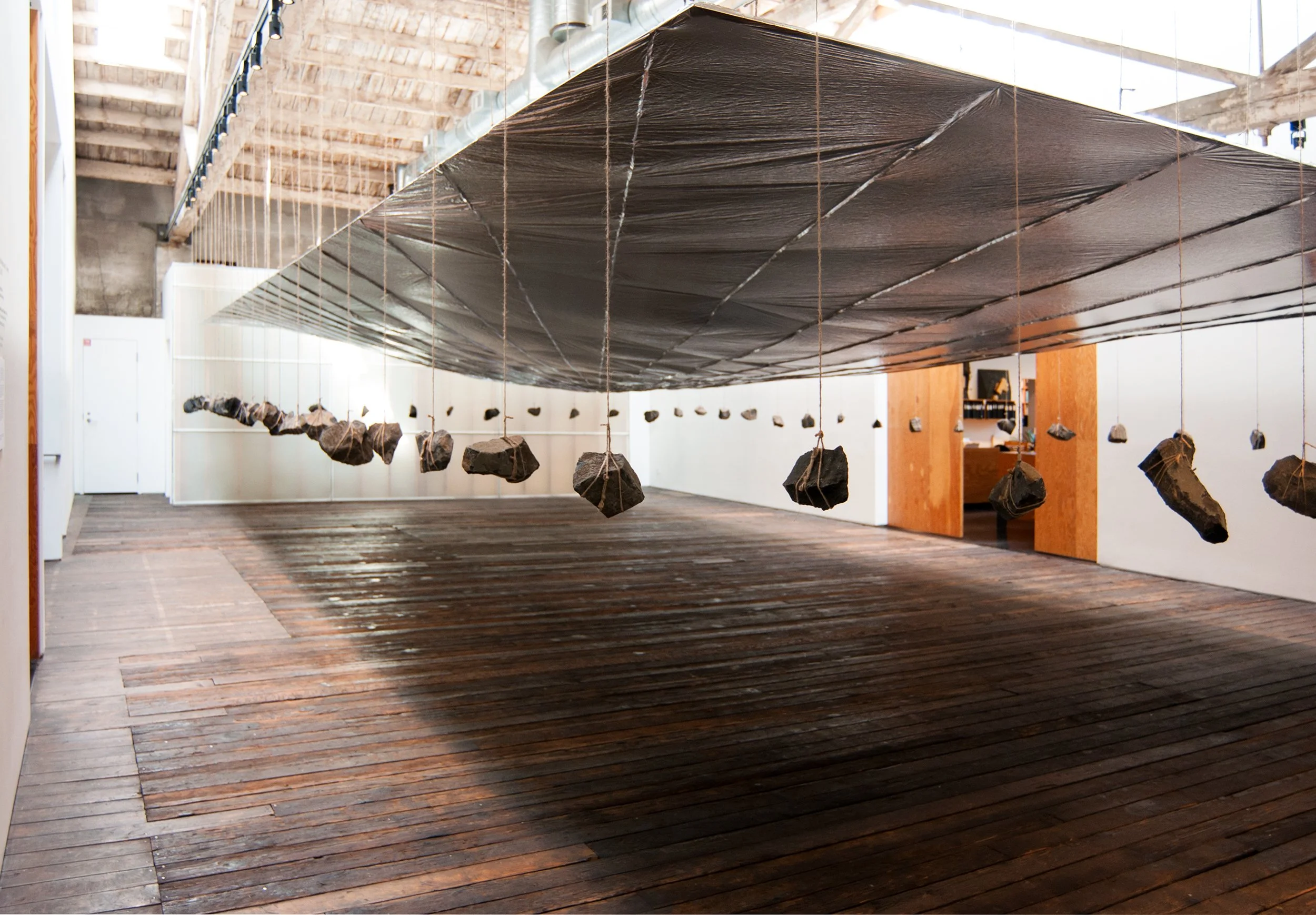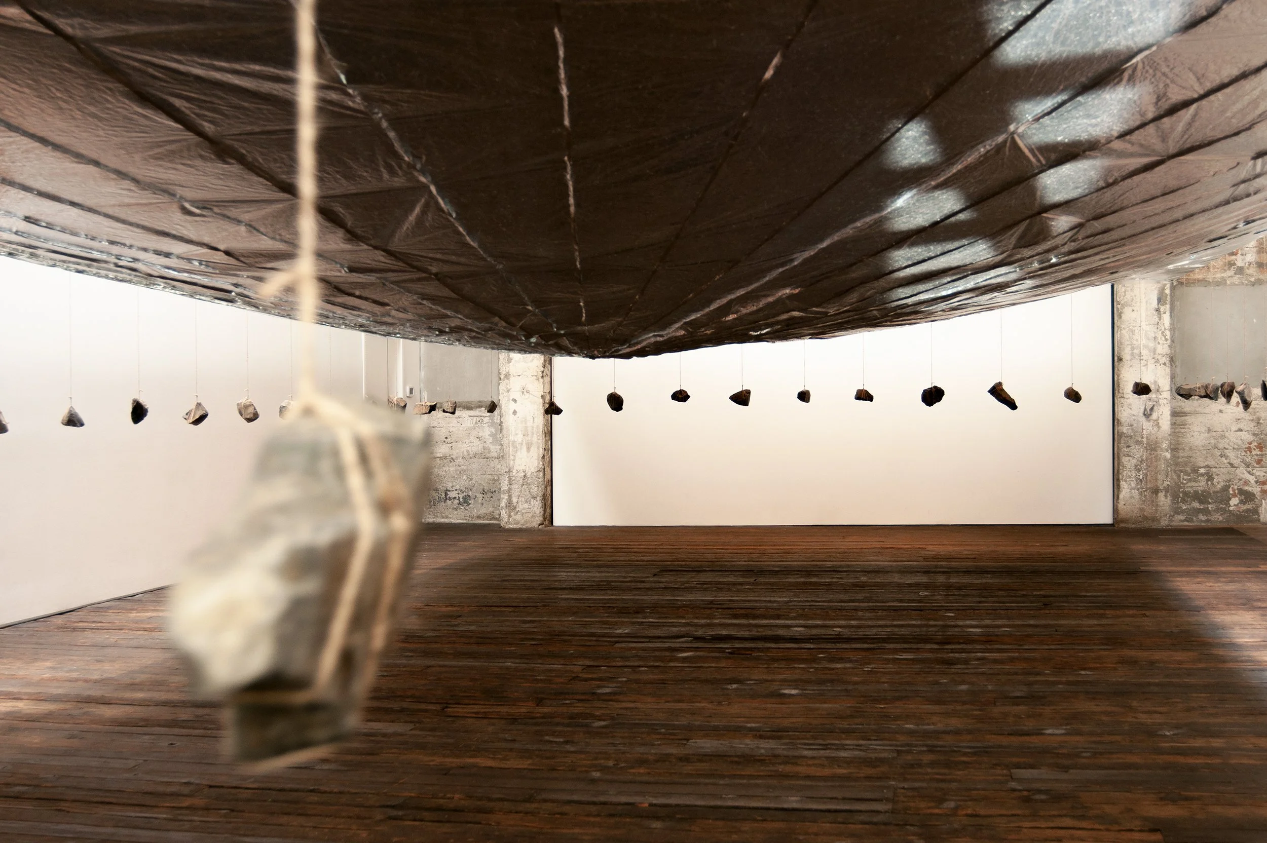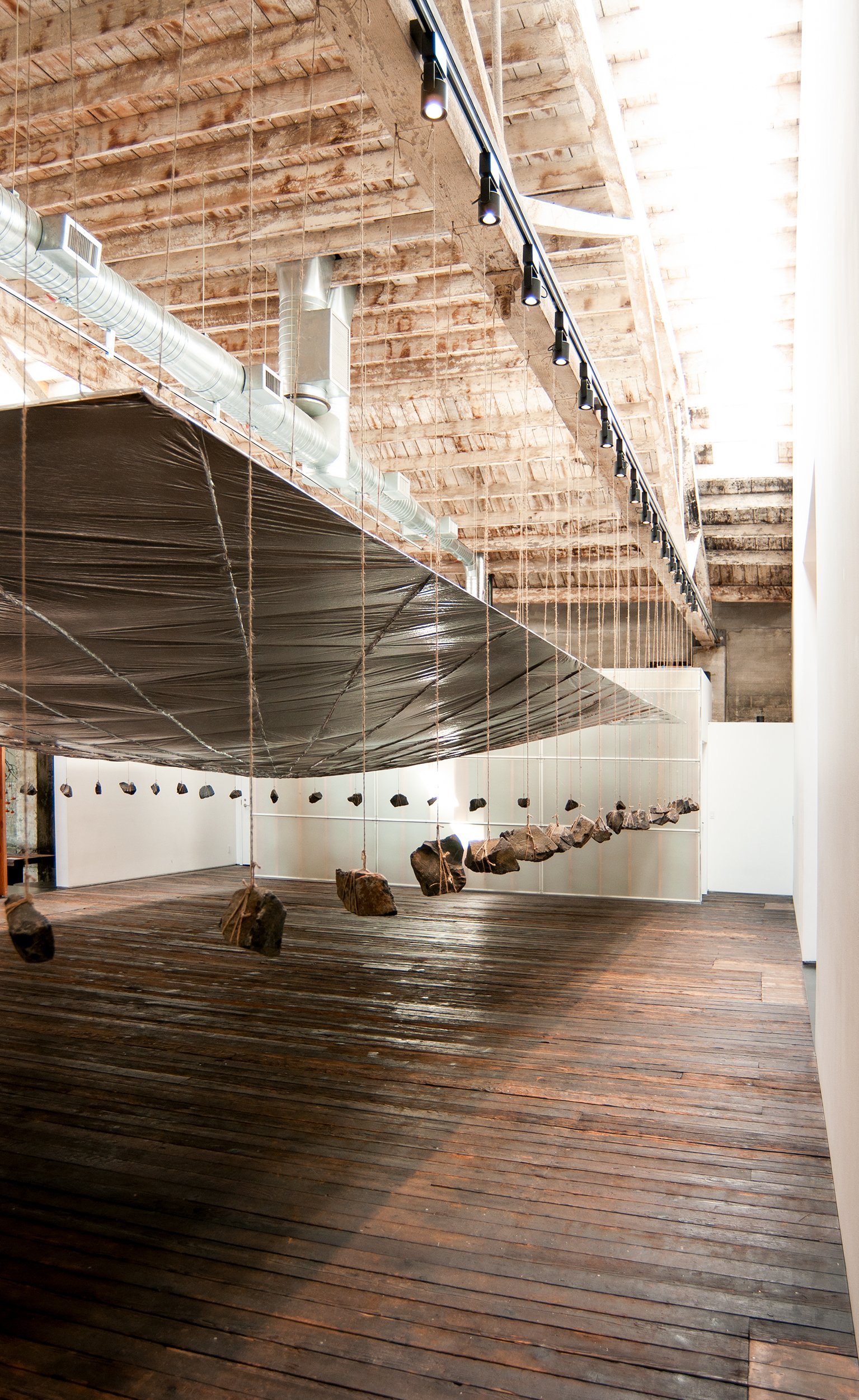 The installation appears simple enough: a continuous reflective plane counter-balanced by the weight of rocks.