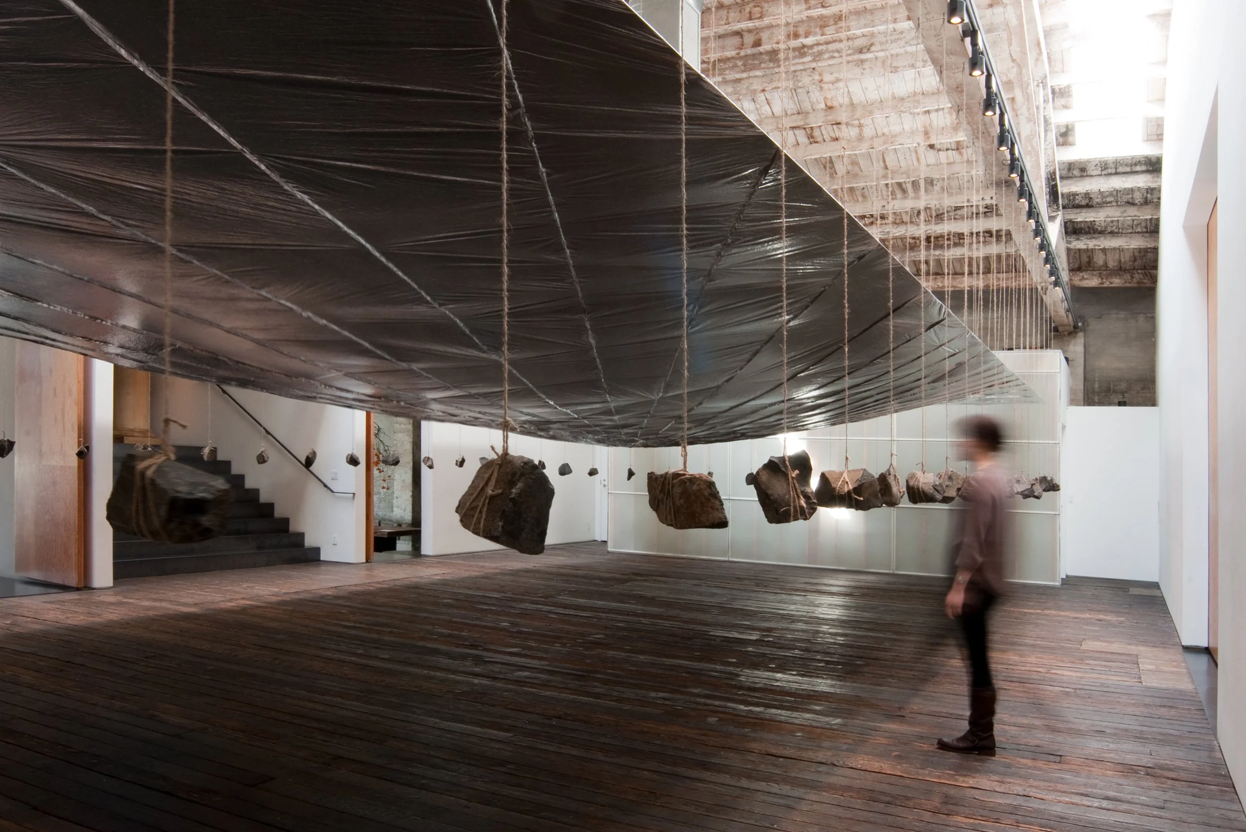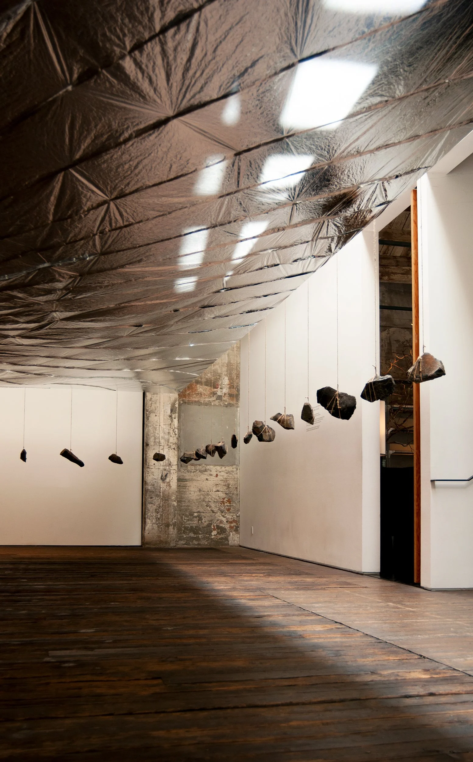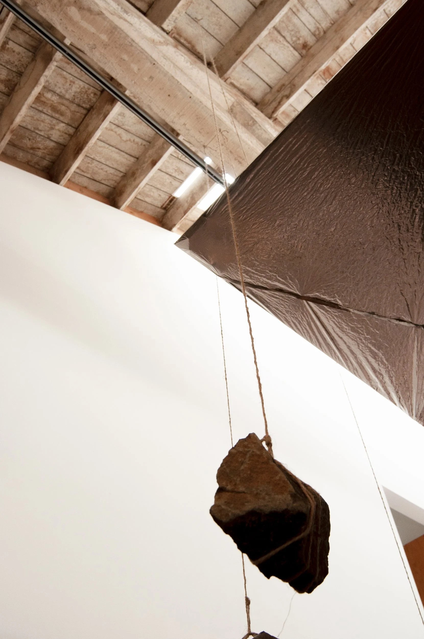 The installation appears simple enough: a continuous reflective plane counter-balanced by the weight of rocks.