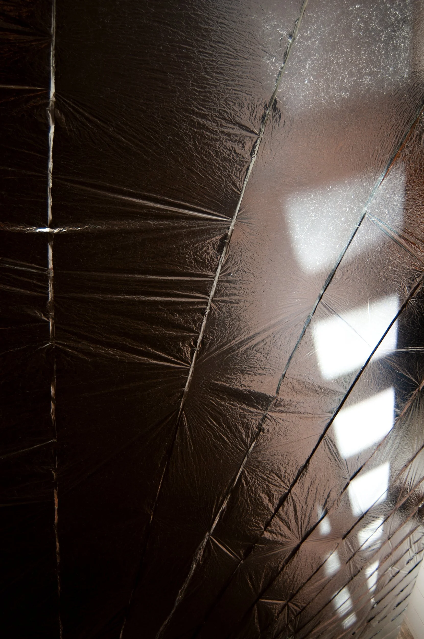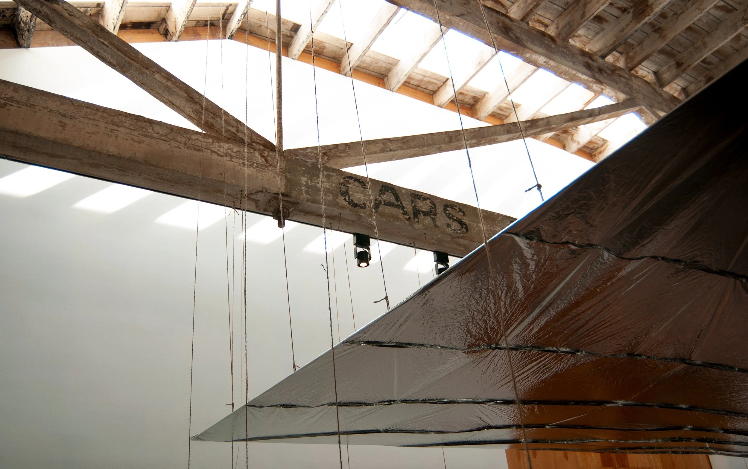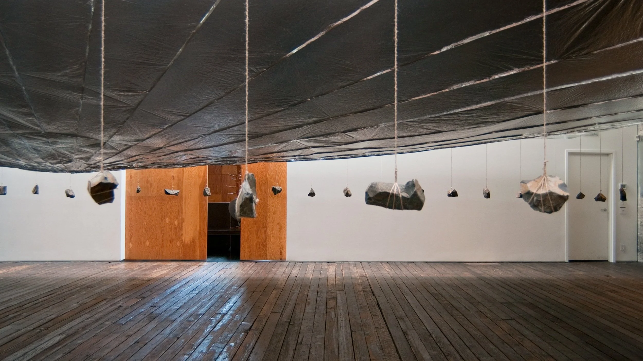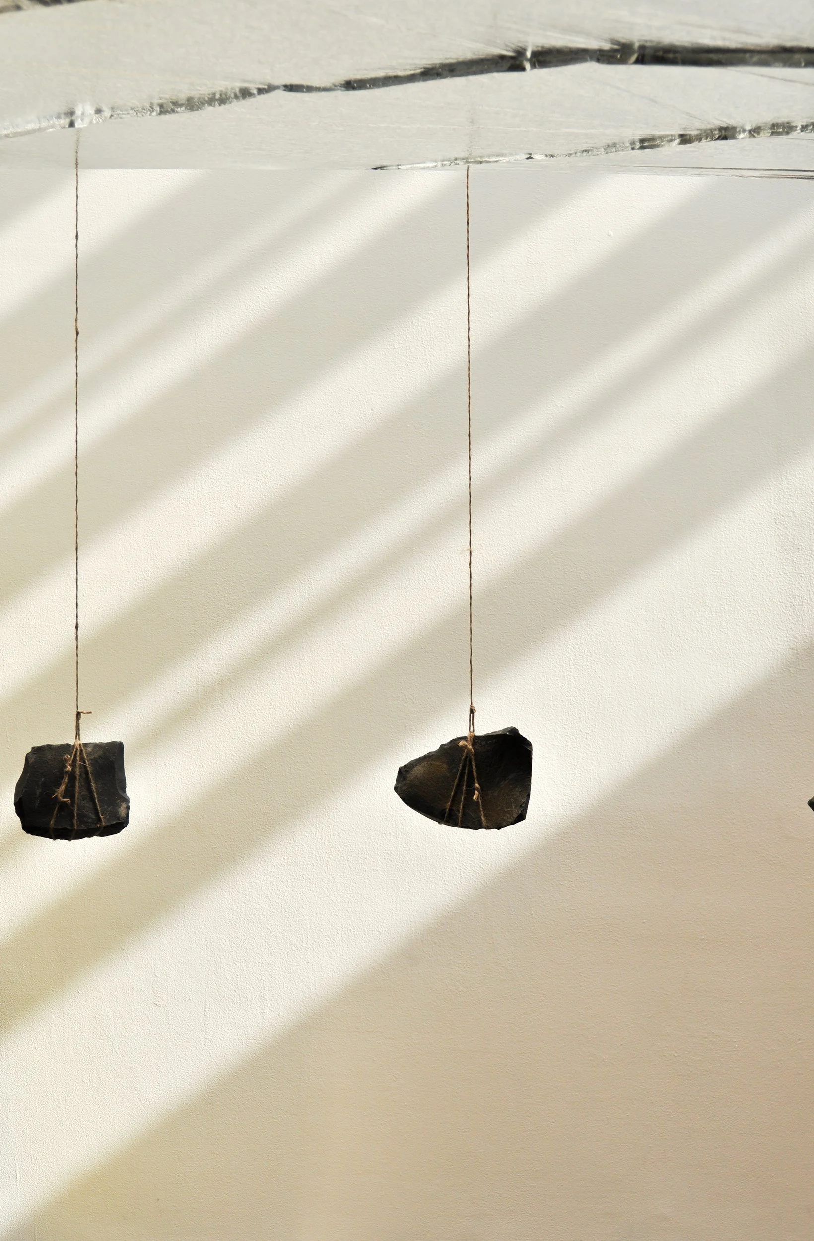 The installation appears simple enough: a continuous reflective plane counter-balanced by the weight of rocks.